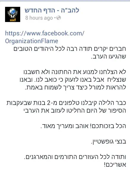ההפגנה אתמול לא הייתה אלימה ואף אחד לא חשב שהיא זאת שתמנע את החתונה הזאת, אלא זה היה נגד החתונות הבאות שח"ו יהיו. וכבר אתמול הגיעו ללהב"ה פניות מ-2 נערות שבעקבות ההפגנה אתמול רוצות לנתק את הקשר שלהן עם בני זוגן הערבים.
