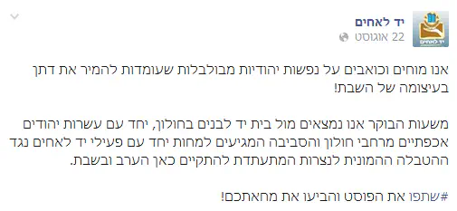הודעה מדף הפייסבוק של יד לאחים ביום שישי האחרון: