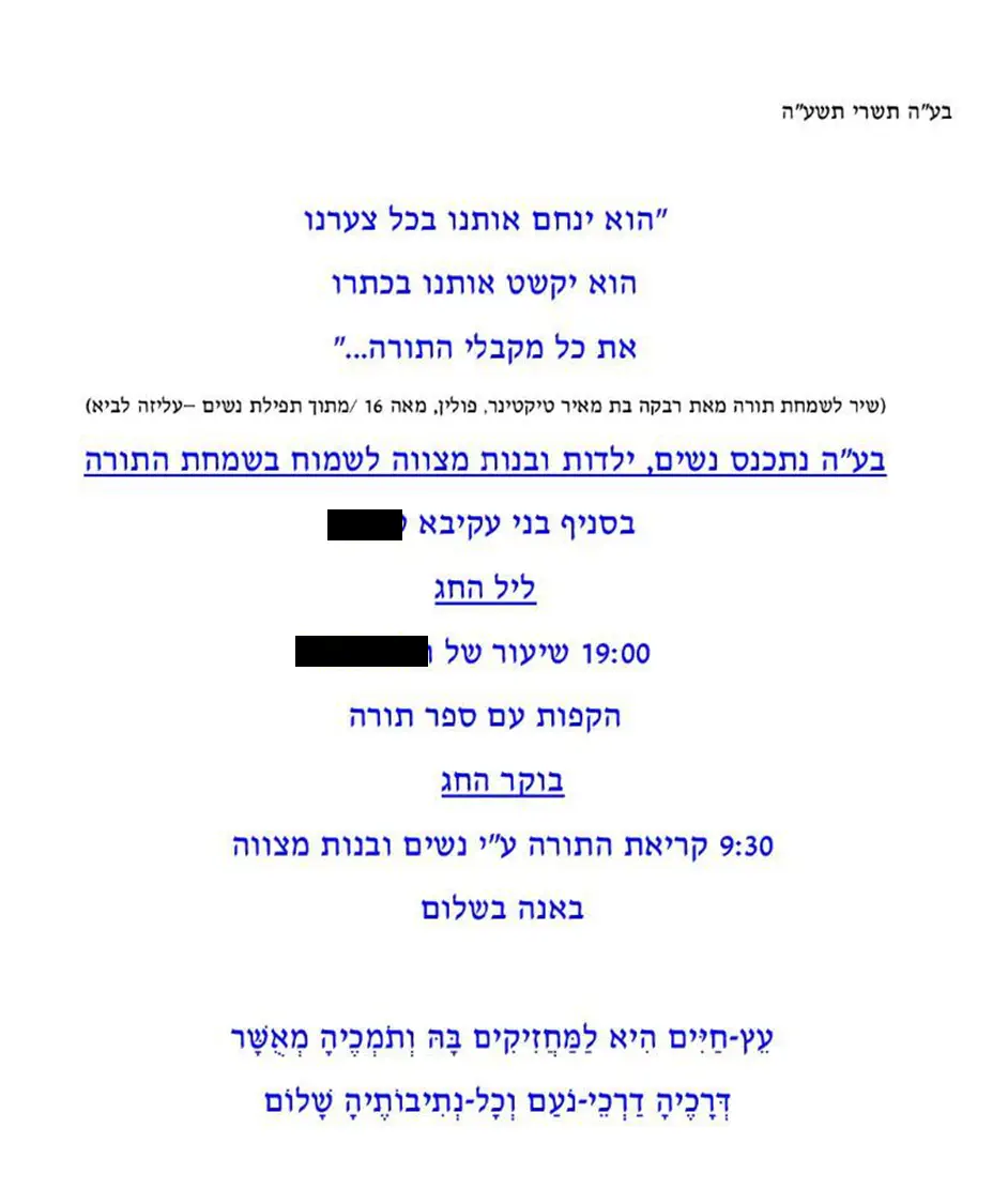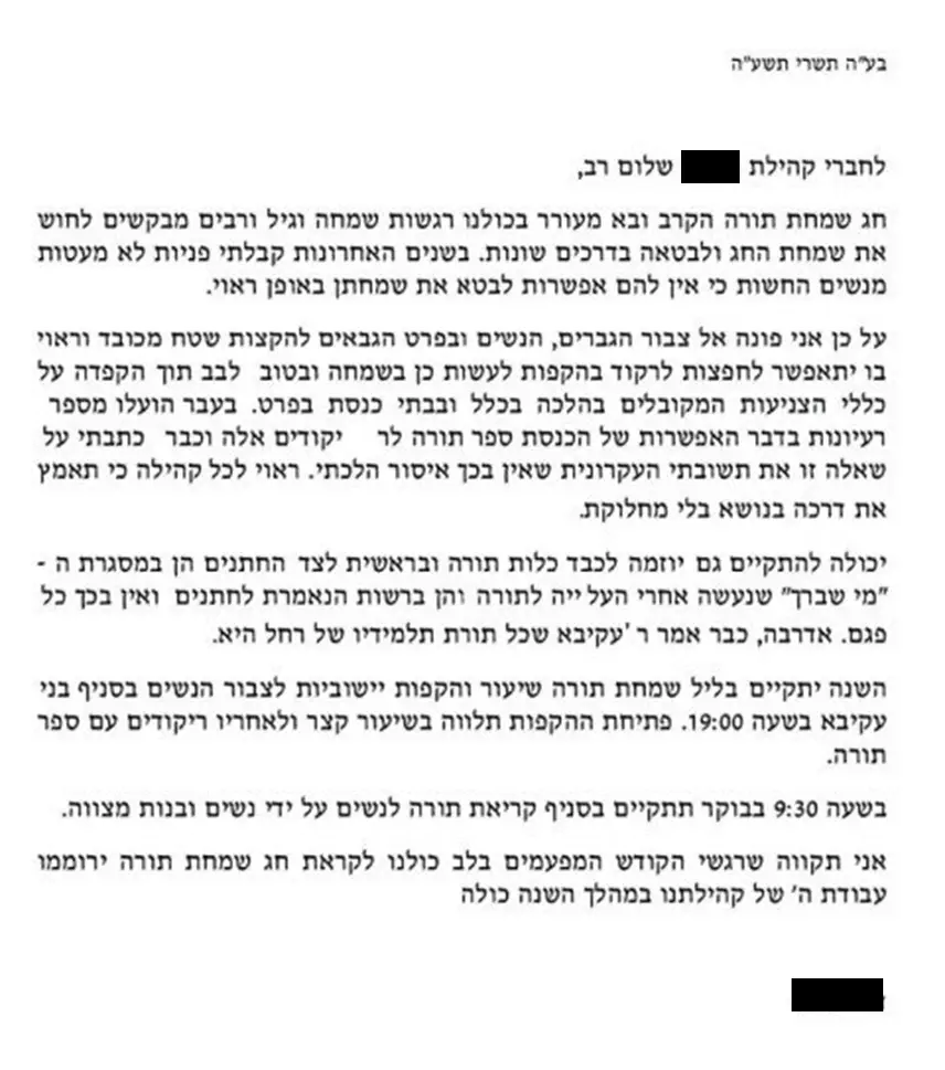 זה מתחיל בקריאה לנשים לבוא ולרקוד עם ספר תורה (מחלוקת הלכתית גדולה ובעייתית שפה לא המקום לעסוק בה) ממשיך בעלייה של נשים לתורה (הגמרא במסכת מגילה דף כ"ג ע"א אומרת כך: "הכל עולין למנין שבעה ואפילו קטן ואפילו אשה אבל אמרו חכמים אשה לא תקרא בתורה מפני כבוד ציבור" וכך גם נפסק להלכה ברמב"ם ובטוש"ע שאישה לא יכולה לעלות לתורה). וזה ממשיך בכך שנשים וגברים ירקדו ביחד עם ספר תורה פתוח.