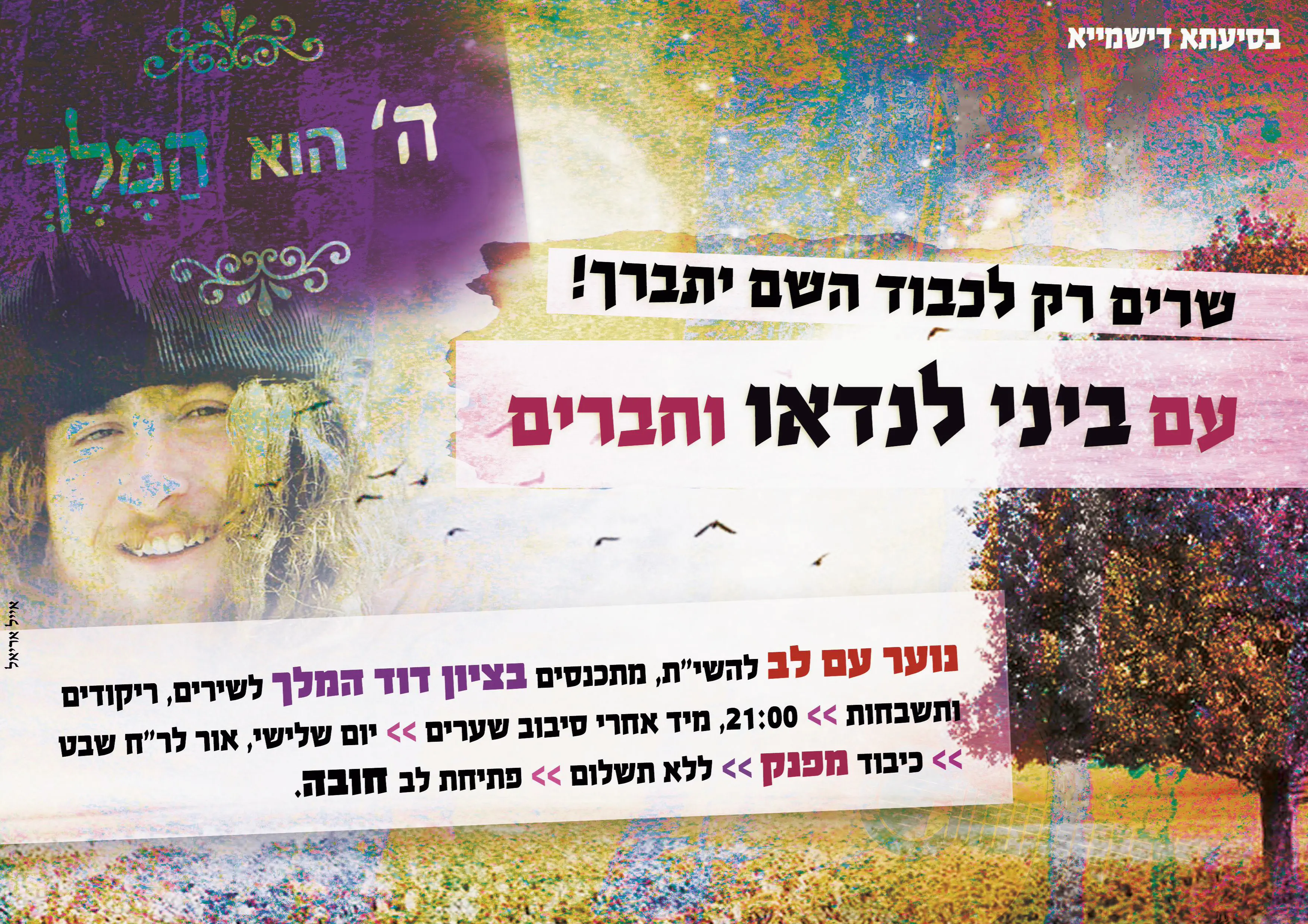 "בנים שירו למלך": אירוע מיוחד עם הזמר ביני לנדאו יתקיים מחר (שלישי) מיד לאחר סיבוב השערים המסורתי סביב שערי הר הבית, בציון קבר דוד המלך בהר ציון שבירושלים. "המטרה באירוע הזה היא מטרה פשוטה אך מכיוון לא רגיל", מסר לקול היהודי עמיאור ארציאל ממארגני האירוע.