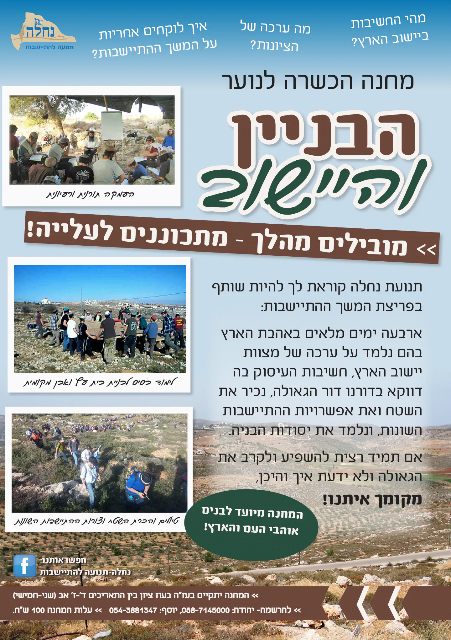 במחנה ילמדו על עניין א"י מבחינה תורנית ומעשית, ולימוד על בסיס הבניה.