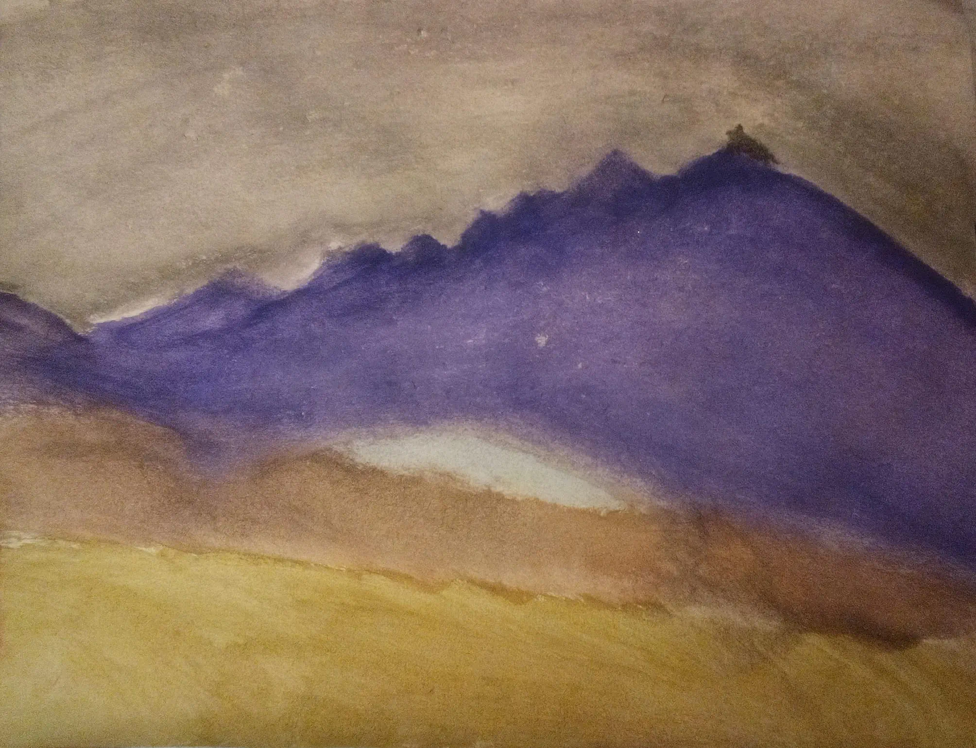 התכוונתי שהחלק התכול יהיה אגם קטן, אבל הוא דומה יותר לכיפת קרח. ואז זה לא מסתדר עם ההר השני, שגם אמור להיות מכוסה בקרח, אם הוא באותו גובה. מצד שני, בגלל שאלו צבעי מים, וכבר עשיתי כל־כך הרבה תיקונים ושינויים, הנייר יתפורר אם אתעלל בו עוד, אז וואטאבר שיהיה.