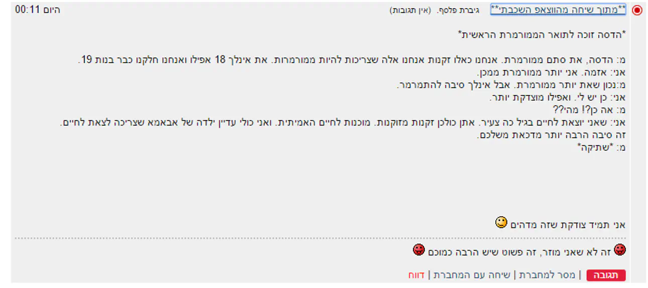 #פוטוסינתזה ושלל חברותיה#נסיופים או נסיופיסטים#מחר מחר מחר מחר גומרים ת'יסודי#או שלא#אתמול מת. בינתיים שרשור משפטים ששורדת אוהבת#שרשור תיוג למשועממים בלבד#חידון הארי פוטר???#אסור להכניס ילדים למוזיקה, התוצאות - עדי ביטי#מה מביא לנו סיפוק?#עדכונים בוואטסאפ - ממתי לסמיילי יש צבע עור?!#מקומות חדשים וכבישים מסוכנים#היום מה בפח!!!!#