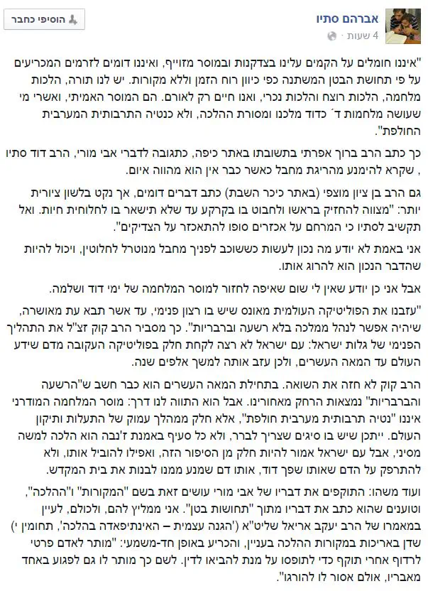 הרב אברהם סתיו ציטט מקור מחשבתי כתגובה לטענות לא הלכתיות (מוסר נוצרי וכו) שהופנו כנגד אביו.