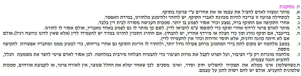 ב. לכתחילה פגיעה זו צריכה להיות מכוונת לאברי התוקף. יש להזהר ולהימנע מלהורגו, במידת האפשר.