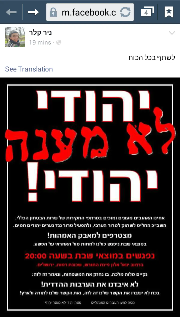 בלב דואב אני זועקת ומתחננת אליך: עצרי את הפשע הזה! שלומו ובריאות נפשו של בן אחי וחבריו נתונים בסכנה ממשית, ואם לא תיעצר מייד החקירה הדורסנית, לא תוכלי לומר שידייך לא שפכו את הדם הזה!