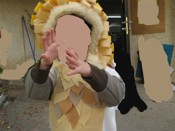 אבל השקעתי בעיקר ברעמה- גזרתי קפוצון של מעיל צמר ישן וחום שהיתה לו פרווה כזו סביב לראש