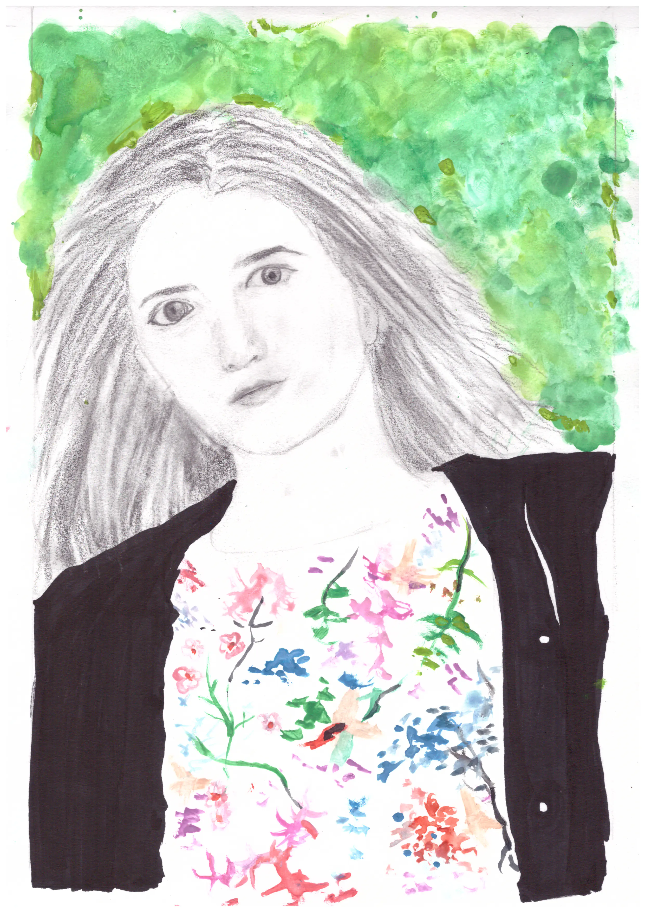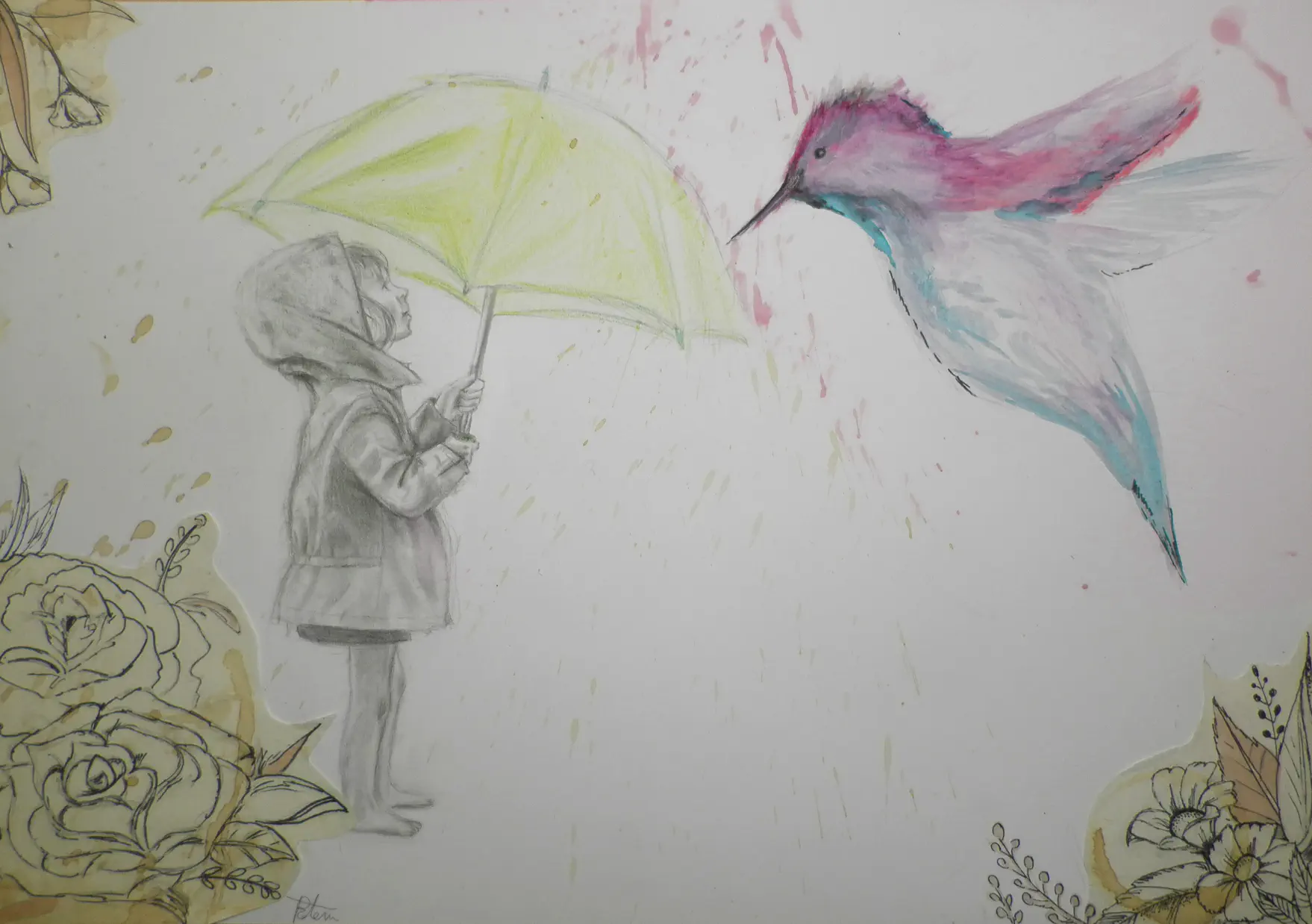 עפרון מכני (ילדה), צבעי עפרון (מטרייה), צבעי מים (יונק דבש), עט (פרחים) וגזירי נייר שספגתי בקפה.