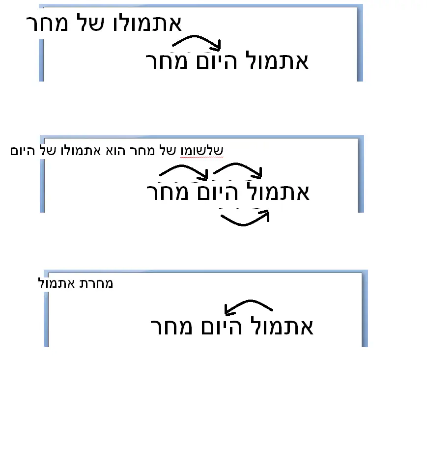 (הצעה לקוראים אולי- לקחת פתק קטן וכתוב את המילים "אתמול מחר היום" בזה אחר זה ועקוב. אפשר לעשות את זה גם פה.....)