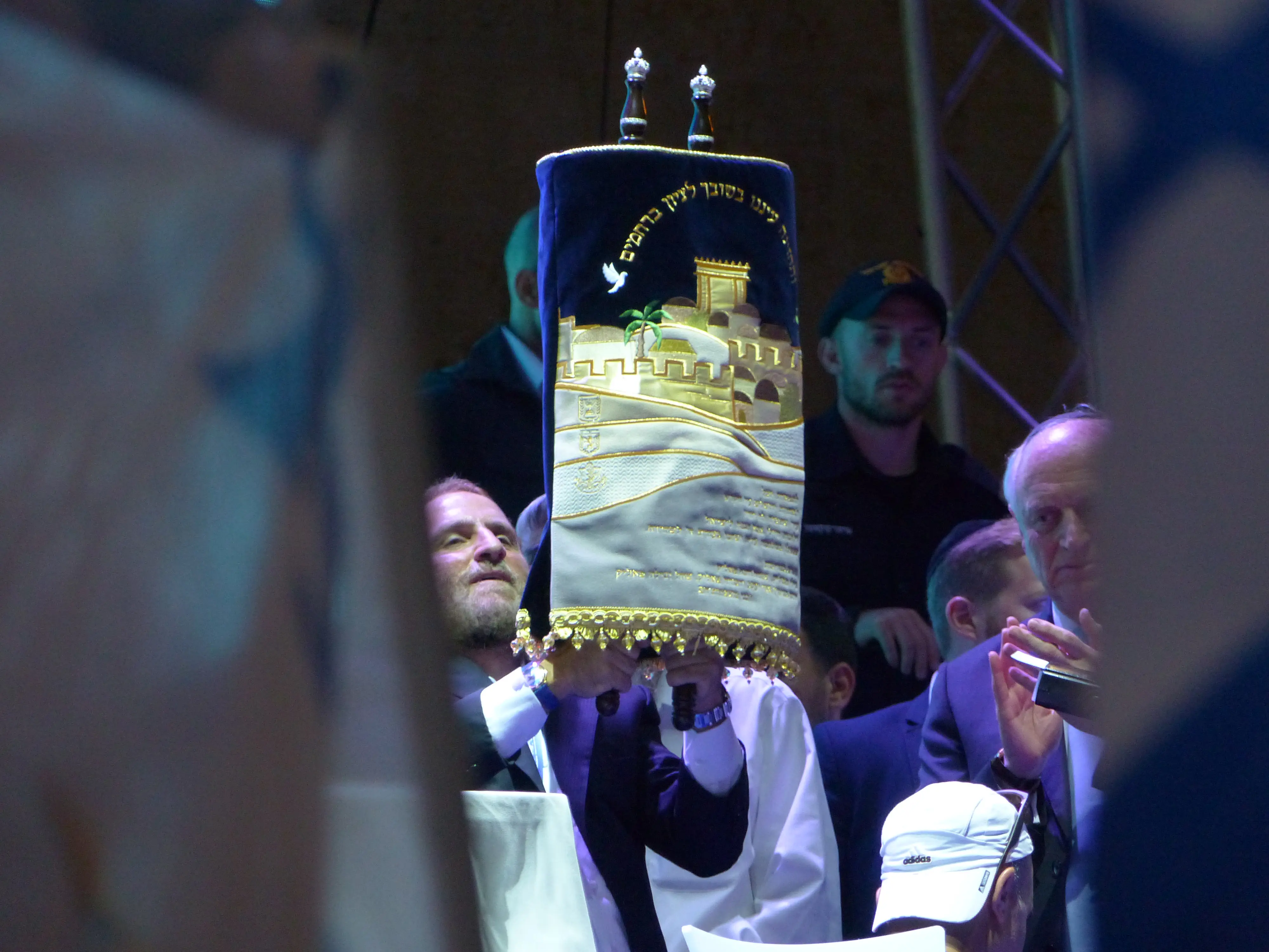 תמונה של שיבולים, תמונה של ספר תורה ותמונה של הרבה אנשים.