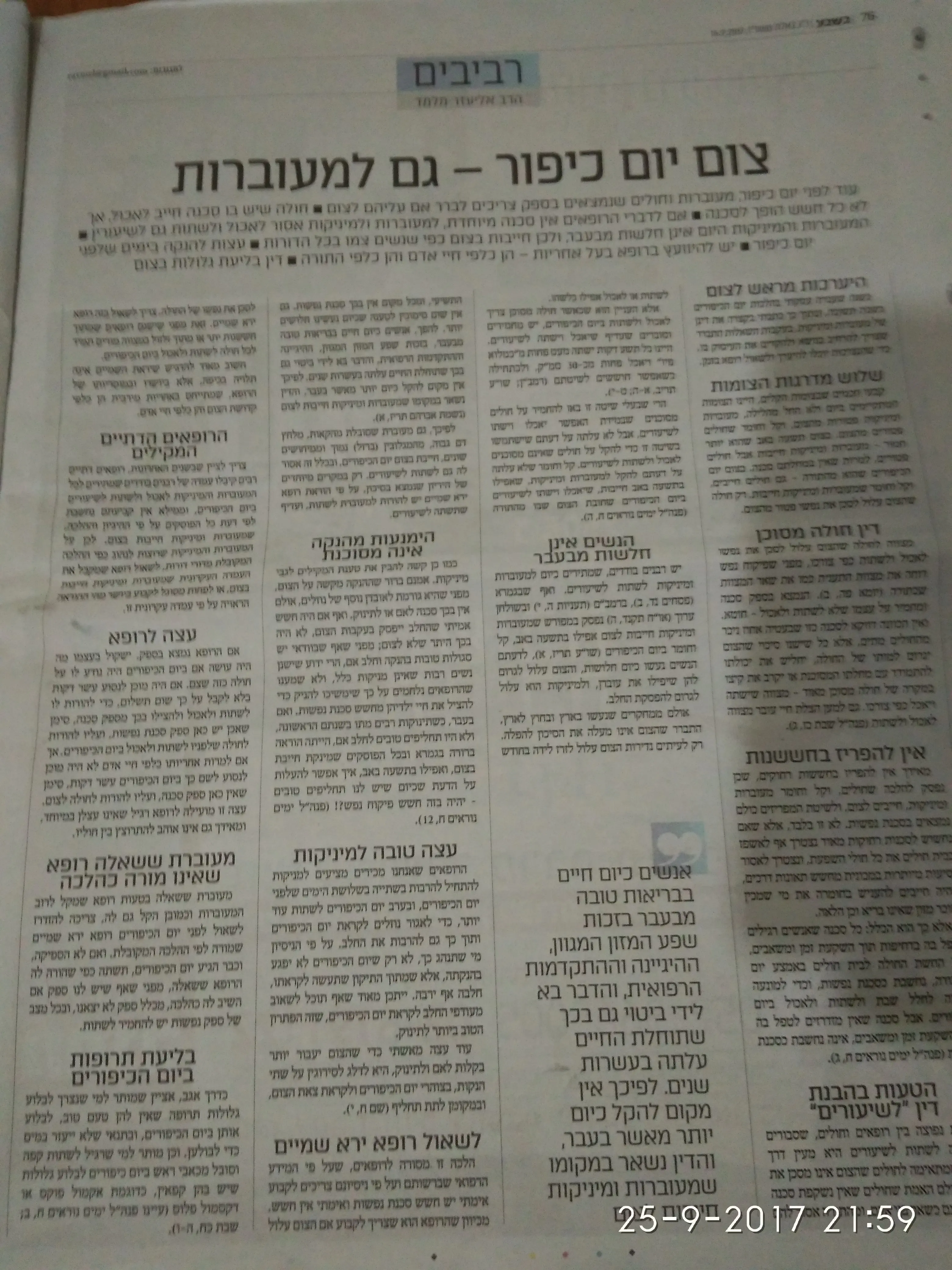 (1) השולחן ערוך פוסק שמעוברות ומניקות צריכות לצום בתשעה באב, נקודה. אבל הרב רבינוביץ' כותב כך: "לרוב הראשונים מעמדו של תשעה באב אינו אלא כשאר איסור דרבנן, ולא גזרו במקום חולי. אמנם המנהג הוא להחמיר בו, אבל מעיקר הדין יש מקום להקל לחולה שאין בו סכנה כמו בשאר הצומות. כבר כתבו הפוסקים שהדורות האחרונים נחלשו לעומת הדורות הראשונים; ולפיכך יתכן שמה שנהגו הראשונים, אין בכוחם של האחרונים לסבול. על כן יש להעמיד את הדברים על עיקר הדין, ובפרט בענין שיש בו אפילו ספק רחוק של סכנת נפשות".