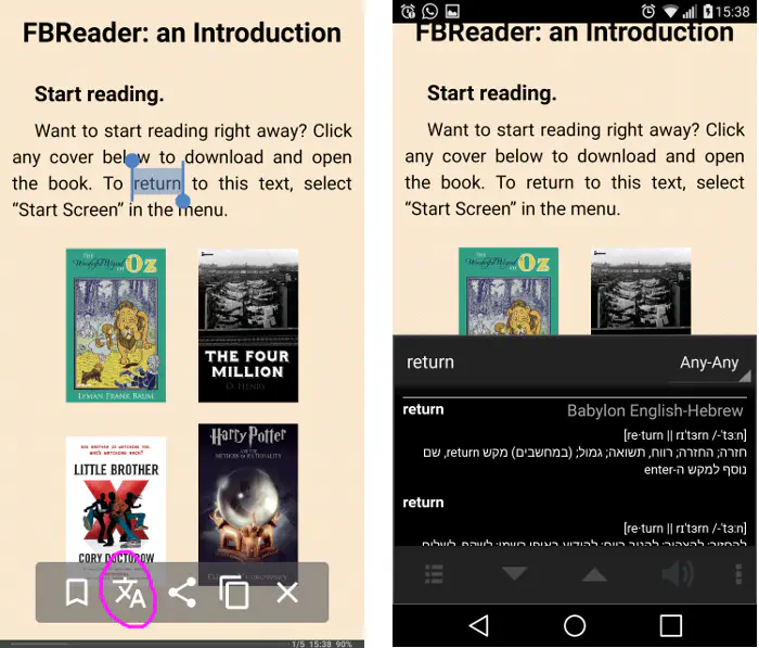 5. Open FBReader, chose a book, press on a word, press on the icon with a Chinese letter, and the translation will be popped, as below.