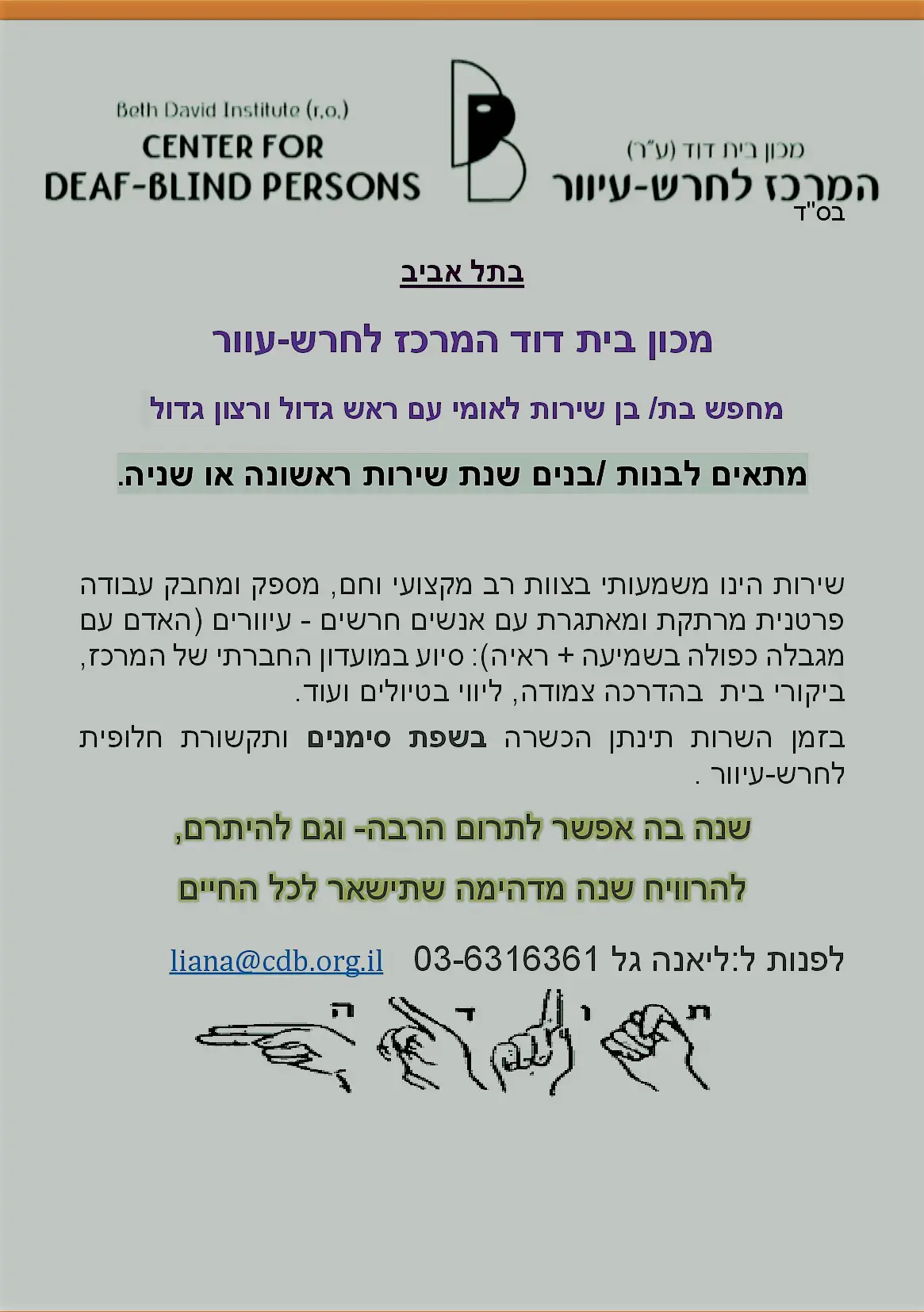 מרכז חרש-עיוור בתל אביב מחפש בת/בן שרותמרכז לחרש-עיוור