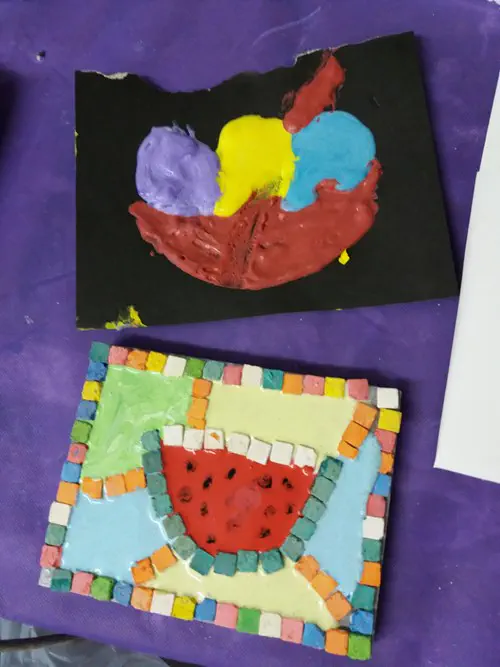 2.הרבה יצירות שקשורות לקיץ: הכנה של משקפת מציל מגלילי נייר טואלט, להכין דגי כסף מנייר אלומיניום ולהדביק על רקע של ים שהילדים הכינו מצבעי ידיים כחולים (בעקבות הספר כספיון).