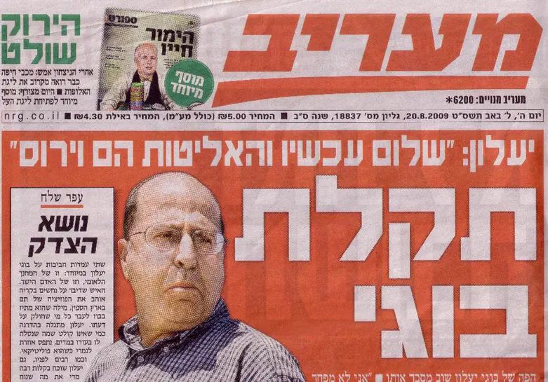 העמוד הראשי של 'מעריב' מכתיר את האירוע כ"תקלת בוגי". לא פחות. אצלם לא יתכן שאדם בעל תפקיד חושב אחרת מהם, חושב שצריך לחזור לחומש, שהמאחזים כשרים, ששלום עכשיו הם לא בדיוק משה רבנו, לא יתכן שכל זה קורה בלי שמדובר בתקלה. "תקלה", לא בעמודי הפובליציסטיקה, בכותרת הראשית...