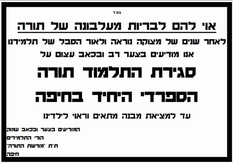 "תלמוד תורה "מורשת התורה" הינו הת"ת הספרדי היחיד בחיפה בו מגדלים מחנכים ומעצבים את גדולי הדור הבא ע"פ מורשת ספרד השורשית והאוטנטית, כל מטרת הת"ת הייתה להחזיר עטרה ליושנה ולספק את צרכיהם הרוחניים והגשמיים של הבאים בשעריו".