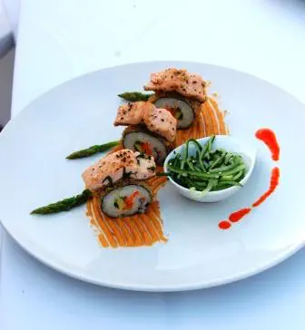 מניחים מעל כל פוטו נתח פורל יוצקים בצד רוטב קולי ובקערה קטנה בצד מלפפונים בתחמיץ