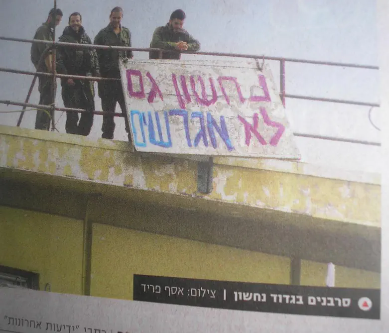 שימו לב לכיתוב שהצמידו ב'ידיעות אחרונות' לתמונת החיילים והשלט הזכור ההוא – "סרבנים בגדוד נחשון" נכתב שם.