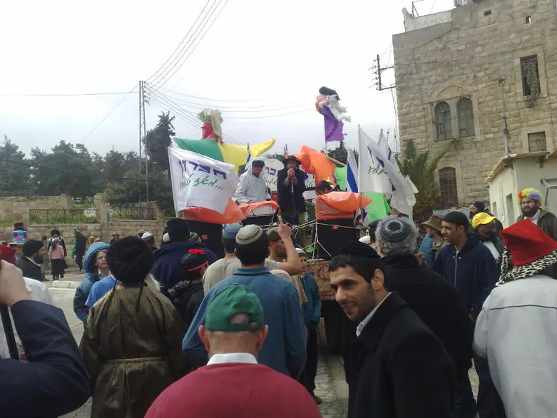מזג האוויר הסגרירי, שהגיע אף למטחי גשם שירדו תוך כדי התהלוכה, דומה שרק הוסיף לשמחה. מאות יהודים צעדו תוך כדי ריקודים אחרי הטרקטור שהוביל עגלה ועליה רמקולים שהשמיעו מוסיקה חסידית שמחה, ואחריו נעה עגלה עם בובות ענק מדמויות המגילה. המסע התנהל בשמחה וללא הפרעה, לאכזבת העיתונאים אך לשמחת המשתתפים. בתקשורת צוין כי אפילו הערבים איחלו "חג שמח".