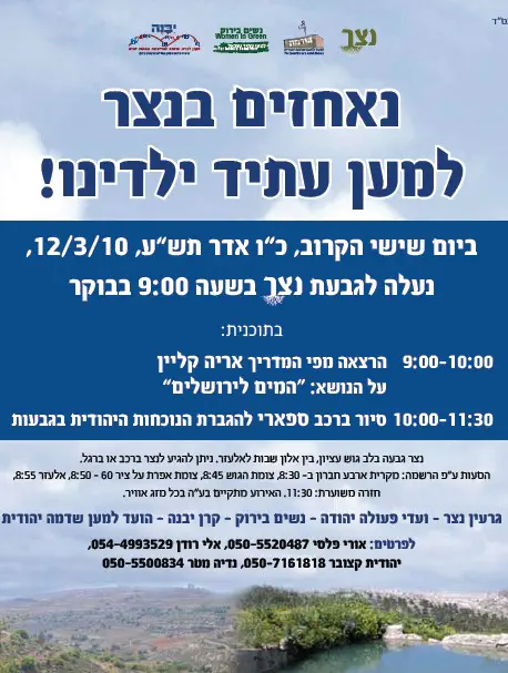 מתיישבי גוש עציון פועלים בימים אלה למניעת השתלטות פלסטינית בחסות ארגונים אירופאים על קרקעות באזור גוש עציון, ביום שישי הקרוב הם מתכוונים לעלות על גבעת נצר להפגנת נוכחות. יהודית קצובר מהוועד למען שדמה, מספרת בראיון לערוץ 7 על הסכנות שטמונות בהשתלטות השקטה הפלסטינית על אדמות הגוש, "הועד פועל כבר חמש שנים בשטח כדי למנוע השתלטות ערבית על האדמות שעדיין לא הוכרזו כאדמות מדינה, הערבים משתלטים לאור היום על אדמות הגוש וכל זה בחסות אירופאית".