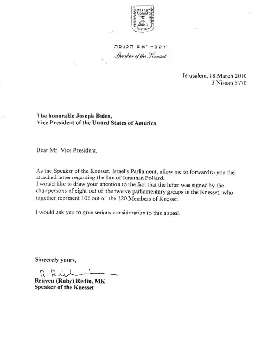 יושב ראש הכנסת רובי ריבלין שלח לסגן נשיא ארצות הברית ג'ו ביידן את מכתבם של רוב יושבי ראש סיעות הכנסת, המבקשים מביידן לחון את יהונתן פולארד עוד לפני חג הפסח. יוזם המכתב, ח"כ אורי אריאל המכהן כיו"ר השדולה למען פולארד, חתום גם הוא על העצומה.