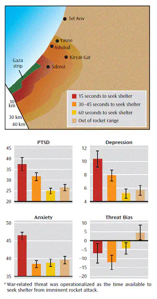 החלק העליון של הגרף מראה את אזורי הדגימה של המחקר ביחס לזמן ההתרעה שקיבלו על התקפת טילים (מרחק מעזה). החלק התחתון מראה את עוצמת הסימפטומים המדווחים על פוסט טראומה (PTSD), דיכאון וחרדה מצבית. מידת הסימפטומים במקומות בהם התרעה ארוכה (דקה שלמה) הייתה נמוכה ודומה לזו שבמקומות מחוץ לטווח הטילים (תל אביב) - ממצא זה מצביע על חשיבות התחושה (והפרקטיקה) שיש מספיק זמן להגיב ולהתגונן על החוסן הנפשי. מצידה השני של המטבע, קיים ריבוי סימפטומים כשמשאבי ההתגוננות דלים והאיום בלתי צפוי (15 שניות התרעה בשדרות וישובי עוטף עזה).