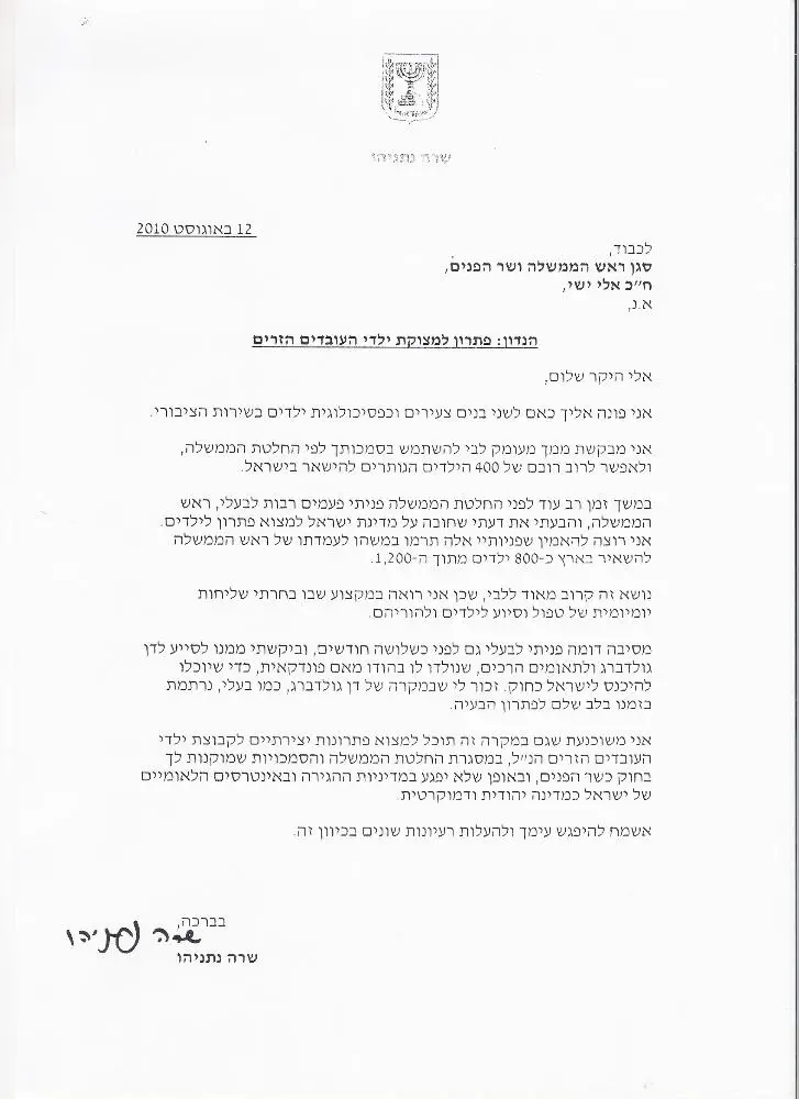 "אלי היקר שלום. אני פונה אליך כאם לשני בנים צעירים וכפסיכולוגית בשירות הציבורי", פותחת נתניהו את מכתבה לשר הפנים. "אני מבקשת ממך מעומק ליבי להשתמש בסמכותך לפי החלטת הממשלה ולאפשר לרוב רובם של 400 הילדים הנותרים להישאר בישראל", הוסיפה רעיית ראש הממשלה."חובה על מדינת ישראל למצוא פתרון לילדים", היא כתבה. "אני רוצה להאמין שפניותיי אלה תרמו במשהו לעמדתו של ראש הממשלה להשאיר כ-800 ילדים מתוך ה-1,200".