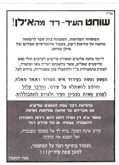בכרוזים שהופצו נכתב בין השאר, כי ראש העיר מבקש "לייסד מחנה פליטים ומאורת פריצים לסדיסטים ערבים חולי נפש שפלים".