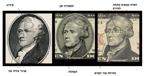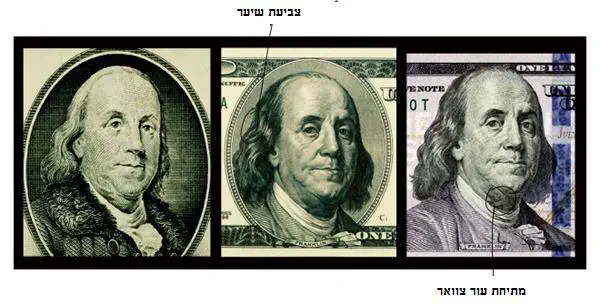 תמונת פרנקלין עברה בשטרות עם ערך שונה במשך שנים, למרות שבנג'מין פרנקלין מעולם לא היה נשיא ארצות הברית. בתמונה משמאל 100 דולרים של שנת 1929, באמצע שטר של 1996 ומימין גרסה אחרונה של שנת 2010. לפראנקלין צבעו את השיער, ועשו מתיחה בצוואר. בתמונה נעשה בנג'מין פרנקלין צעיר במספר שנים.