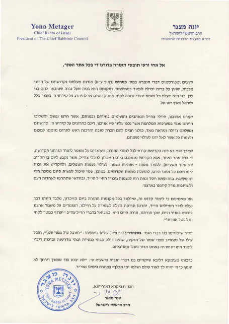 הרב הראשי לישראל הרב יונה מצגר, שיגר היום מכתב בו הוא קורא לכל לומדי התורה ללמוד לעילוי נשמת החללים.