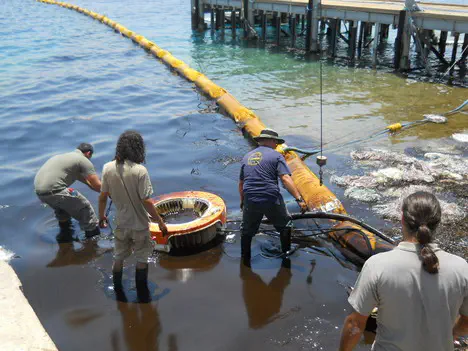 כשתי טונות של שמן מסוג מזוט דלפו מאונייה בחוף אלמוג באילת. אנשי המשרד לאיכות הסביבה מנסים לשאוב את המזוט באמצעים מכאניים ובאמצעות סופגים מיוחדים.