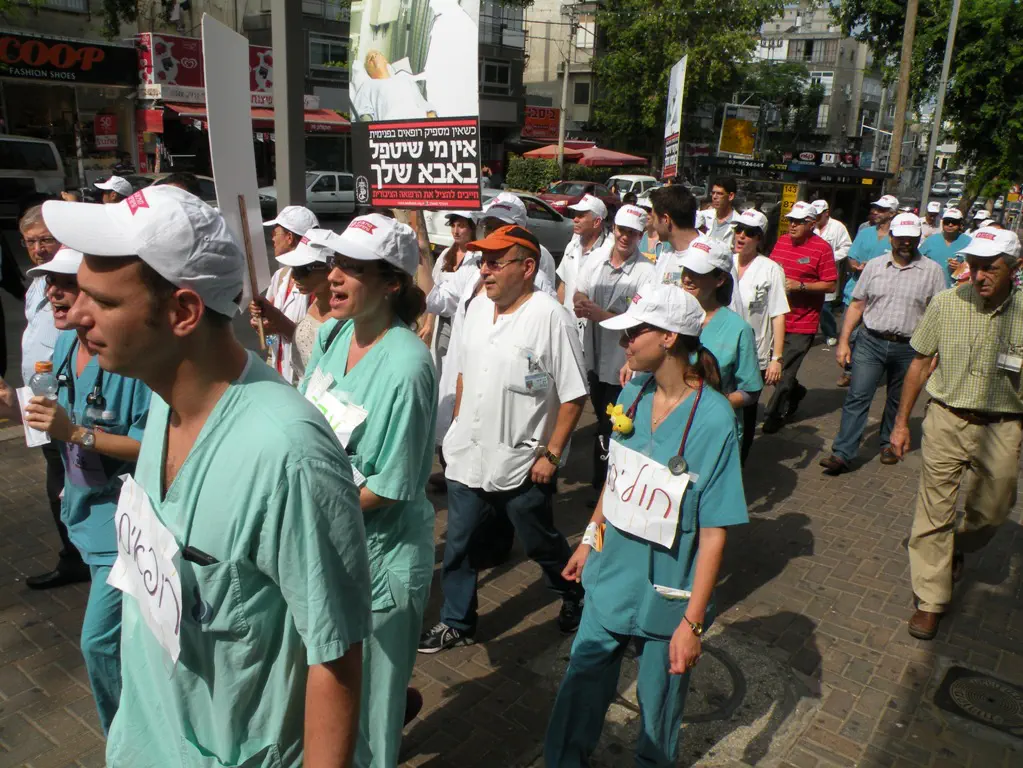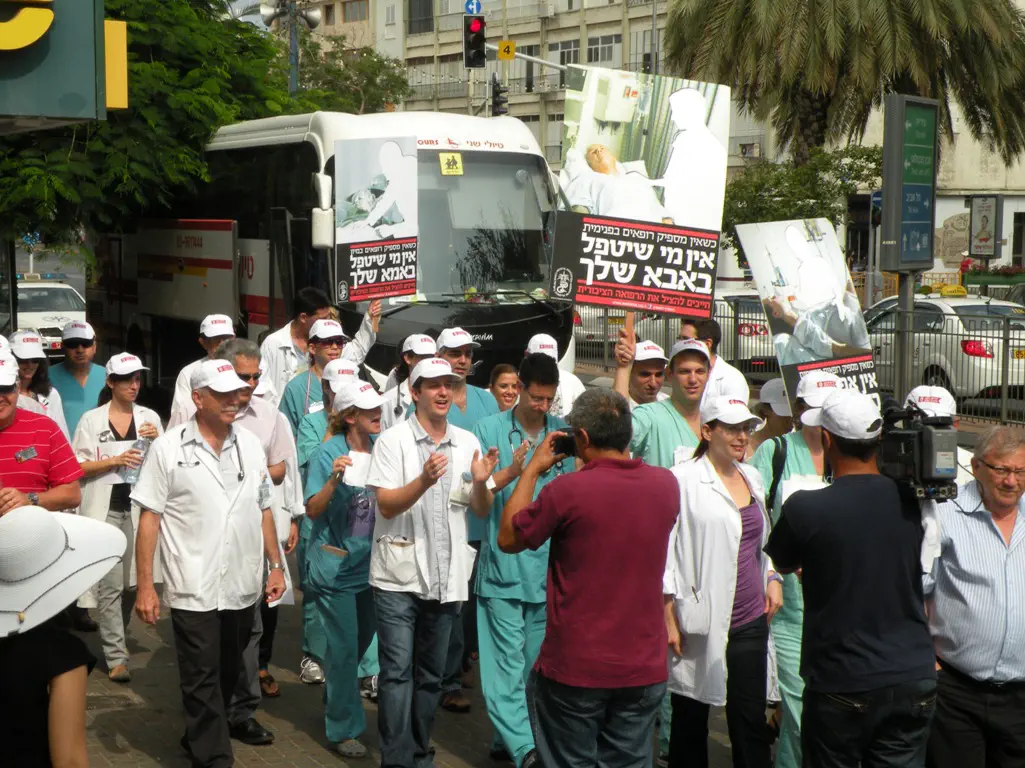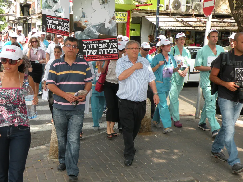בין הצועדים, היו רופאים בכירים וכן רופאים מתמחים מ'וולפסון', אשר אחזו בשלטים ותלו על בגדיהם כתובות כגון: "אני מתחיל עכשיו 26 שעות עבודה", "אני מרוויח 23 ₪ לשעה", "אין מי שיטפל באבא שלך", "אין אפידורל בלידה שלך" ועוד.