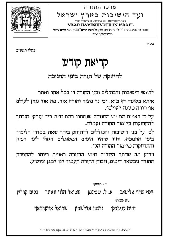 'וועד הישיבות בארץ ישראל' קורא לאברכים לדאוג ל"חיזוקה של התורה בימי החנוכה".