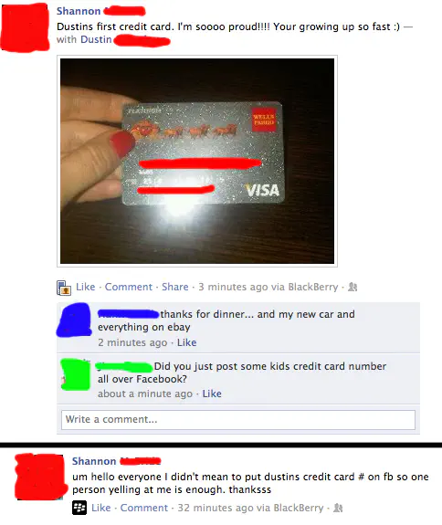 "כרטיס האשראי הראשון של ג'סטין. אני כל כך גאה!!! אתה גדל כל כך מהר :)" כתבה האם הנרגשת וגם צירפה תמונה של הכרטיס שלא יהיו לאף אחד ספקות שבנה היקר הגיע לגיל שאפשר להתחיל. הבעיה? היא פרסמה את זה קבל עם ועדה על קיר הפייסבוק שלה.