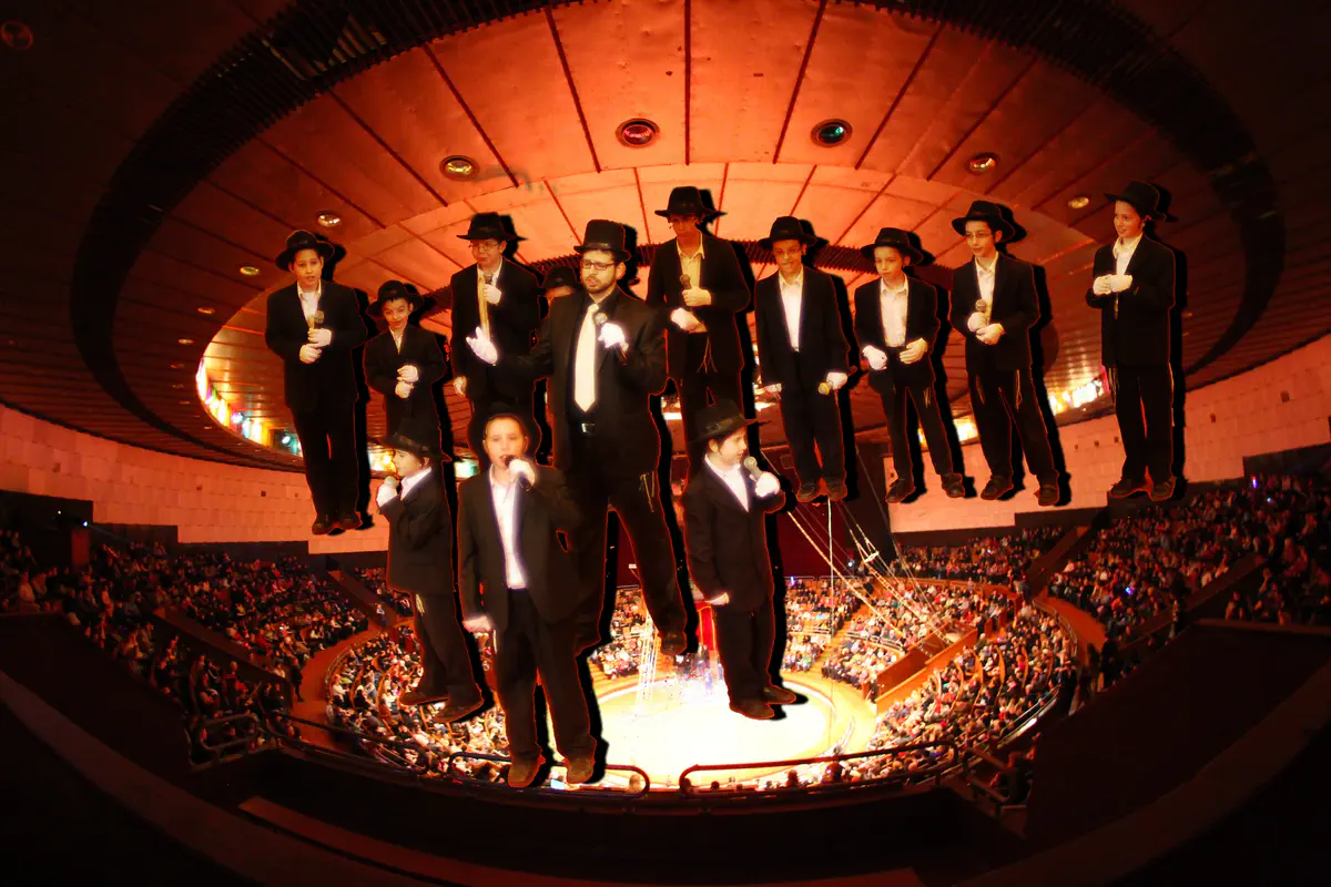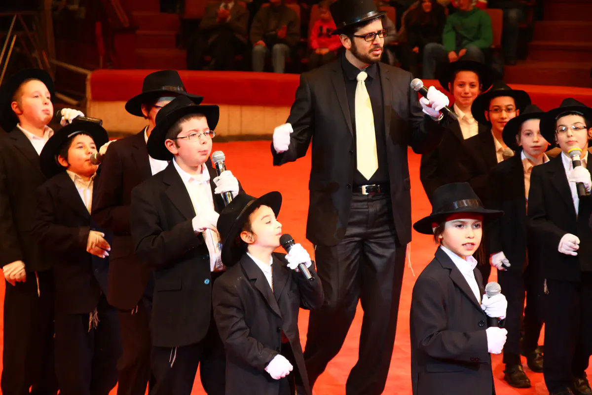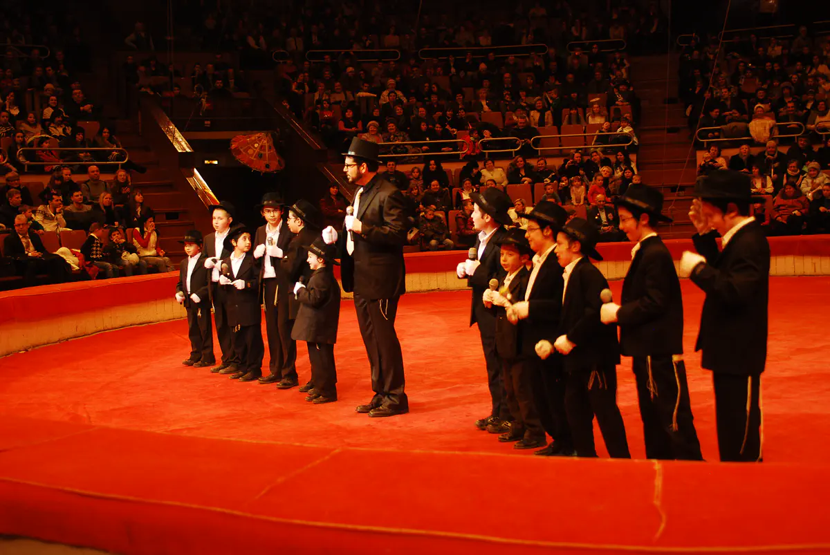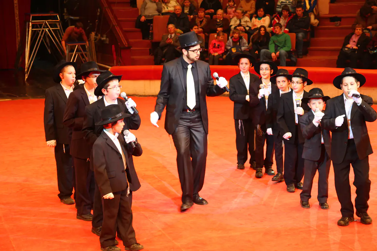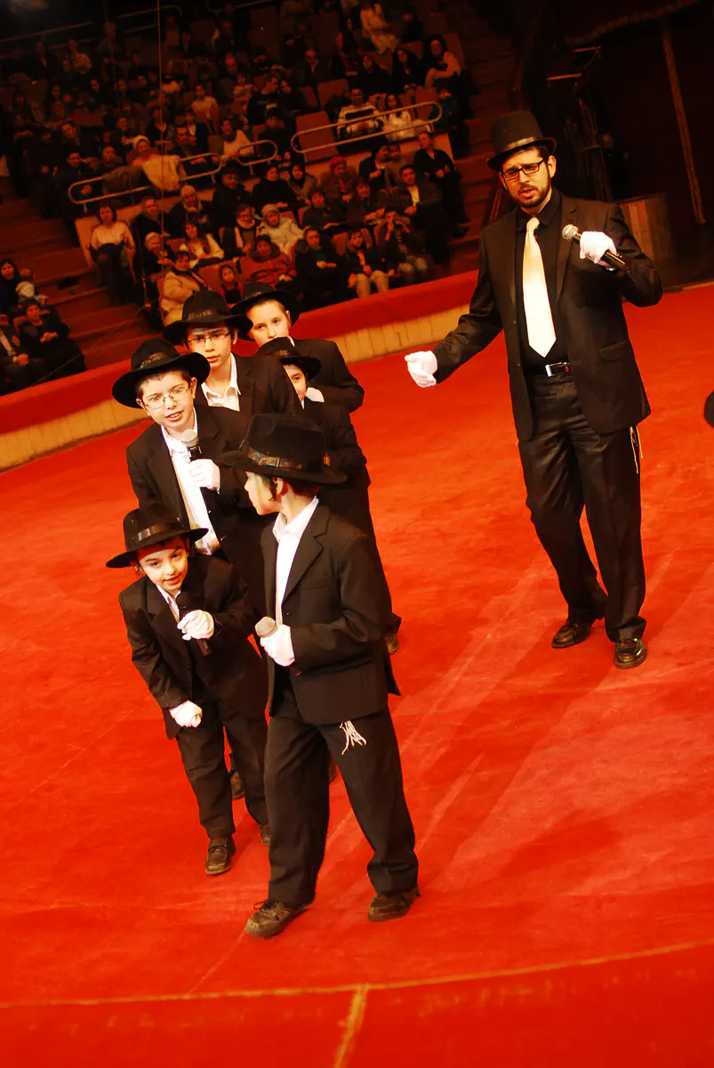 בזירת הקרקס פסע החזן יצחק חלפון כשבעקבותיו צועדים בצעדים מחושבים שנים עשר נערים בחליפות שחורות, כובע שחור וכפפות לבנות, מעין חסידים-ג'נטלמנים. הילדים, תלמידי תלמוד תורה "חדר מנחם" של חב"ד עלו להופעתם הראשונה בציבור.