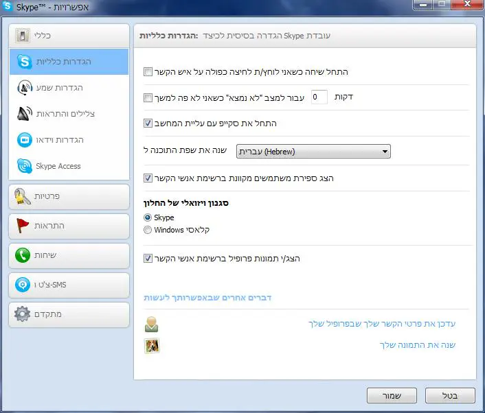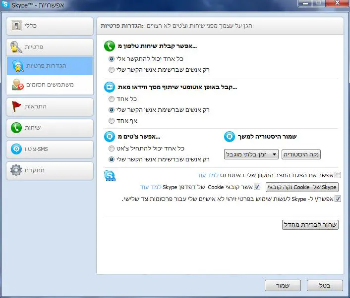 אם אתם משתמשים ב Skype באמצעות מחשב של מישהו אחר או במחשב ציבורי אתם יכולים למחוק את היסטורית השיחה לפני שאתם מתנתקים. זה נעשה כך: בממשק ה Skype שלכם היכנסו ל"כלים" ובחרו ב"אפשרויות" ייפתח לכם החלון הבא: