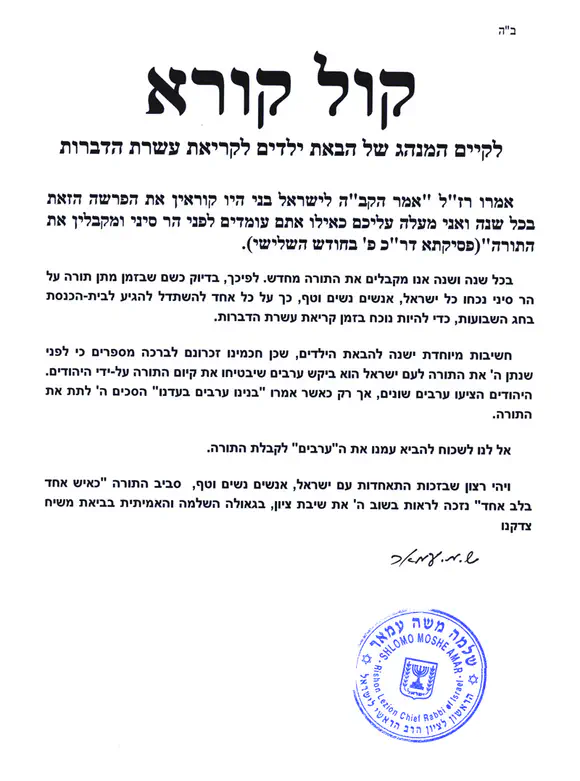 הראשון לציון, הרב הראשי לישראל, הרב שלמה עמאר, יצא בקריאה לציבור להשתדל לבוא בחג השבועות לבתי הכנסת למעמד קריאת עשרת הדיברות.