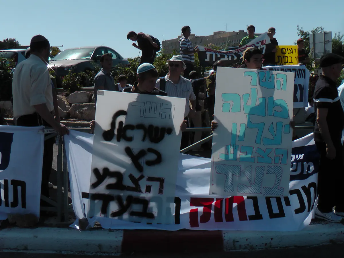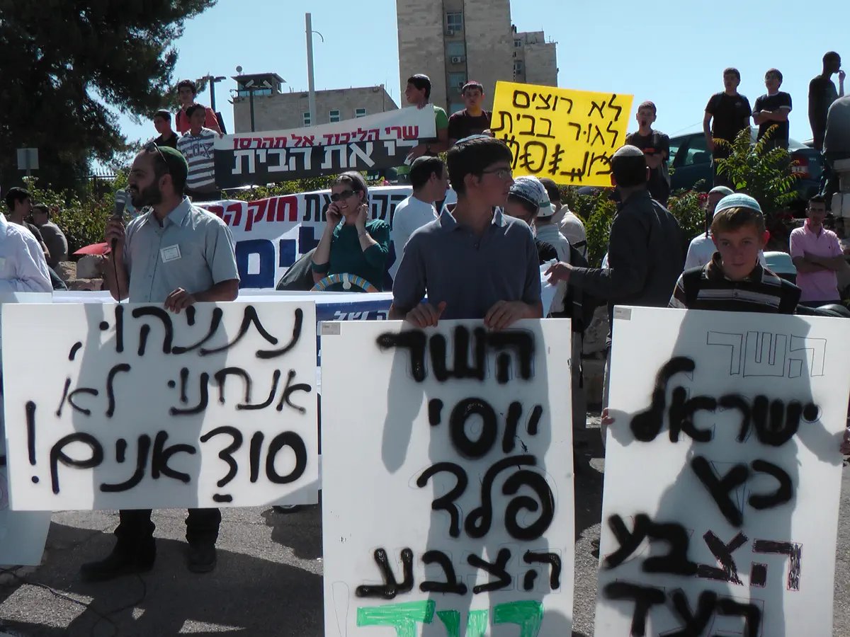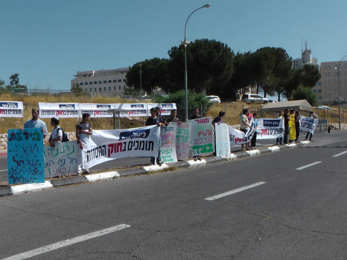 עשרות בני אדם מפגינים מול משרד ראש הממשלה בירושלים בקריאה לשרים להצביע בעד חוק הסדרה שיעלה ביום רביעי בכנסת. הם נושאים שלטים: "לא רוצים לגור בבית מנוסר".