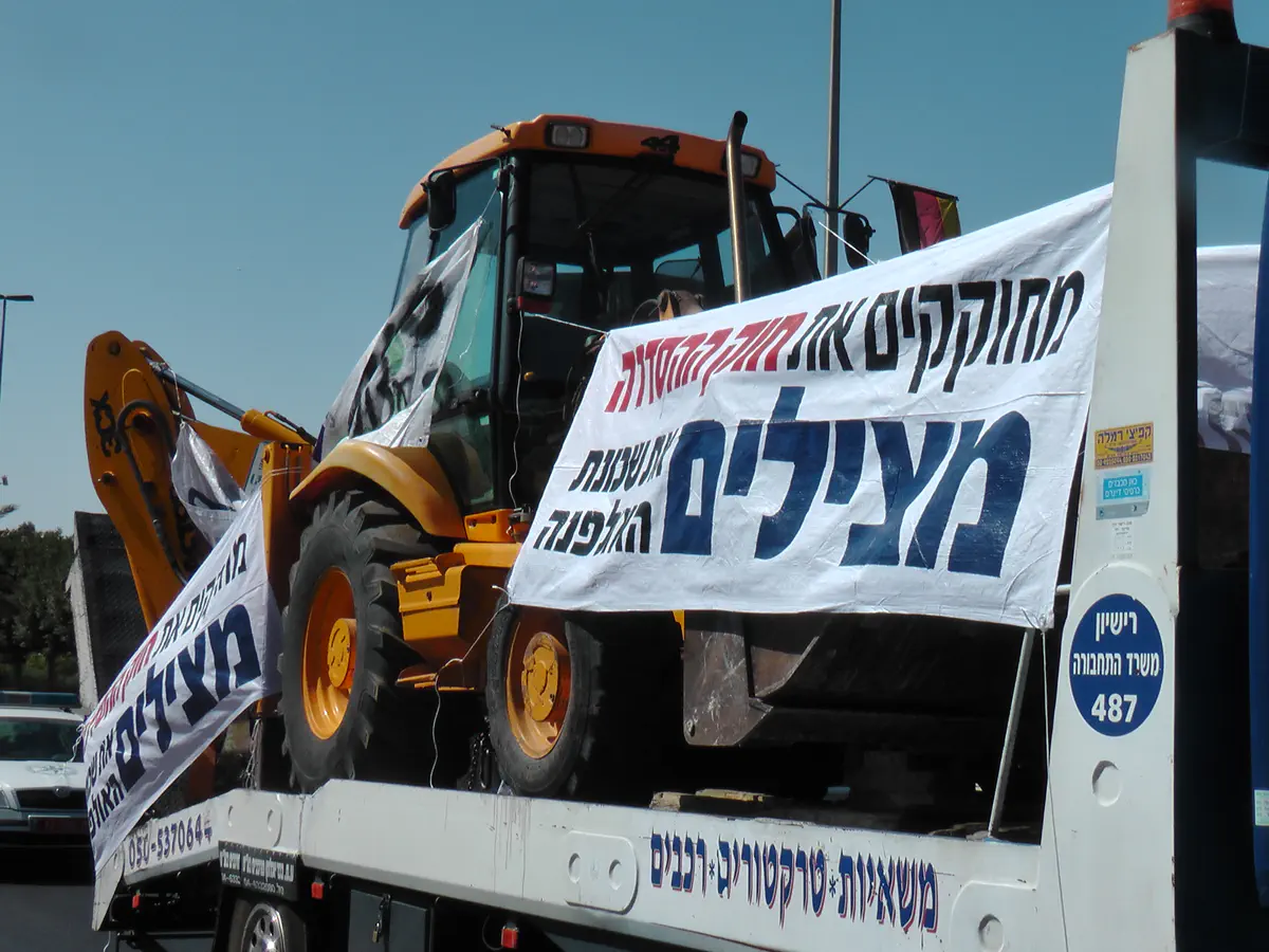 משאית ועליה טרקטור מסתובבת באזור הקרייה ועליה שלטים הקוראים לתמוך בחוק ההסדרה.