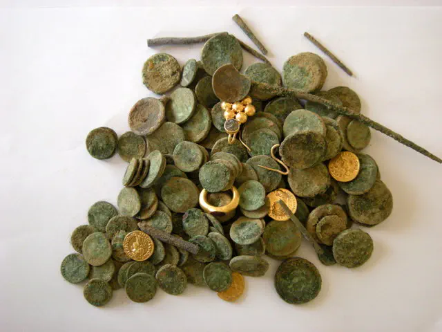 לדברי הארכיאולוג אמיל אלג'ם, מנהל החפירה מטעם רשות העתיקות, "המטמון המרהיב כולל תכשיטים מזהב, ובהם עגיל צרוף ביד אמן בדגם של פרח וטבעת עם אבן יקרה ועליה חותם של אלה עם כנפיים, שני מקלות מכסף שיתכן ושימשו לאיפור, וכן כ- 140 מטבעות מזהב וכסף. המטבעות שנמצאו הם מימי הקיסרים הרומיים נירון, נרווה וטריאנוס, ששלטו באימפריה הרומית בין השנים 54 – 117 לספירה. על המטבעות מתנוססים דיוקנאות של הקיסרים, ובצידם האחר מופיעים תיאורי פולחן הקיסר, סמלי אחוות הלוחמים, ואלים מהמיתולוגיה, כיופיטר היושב על כס או יופיטר מחזיק ברק בידו."