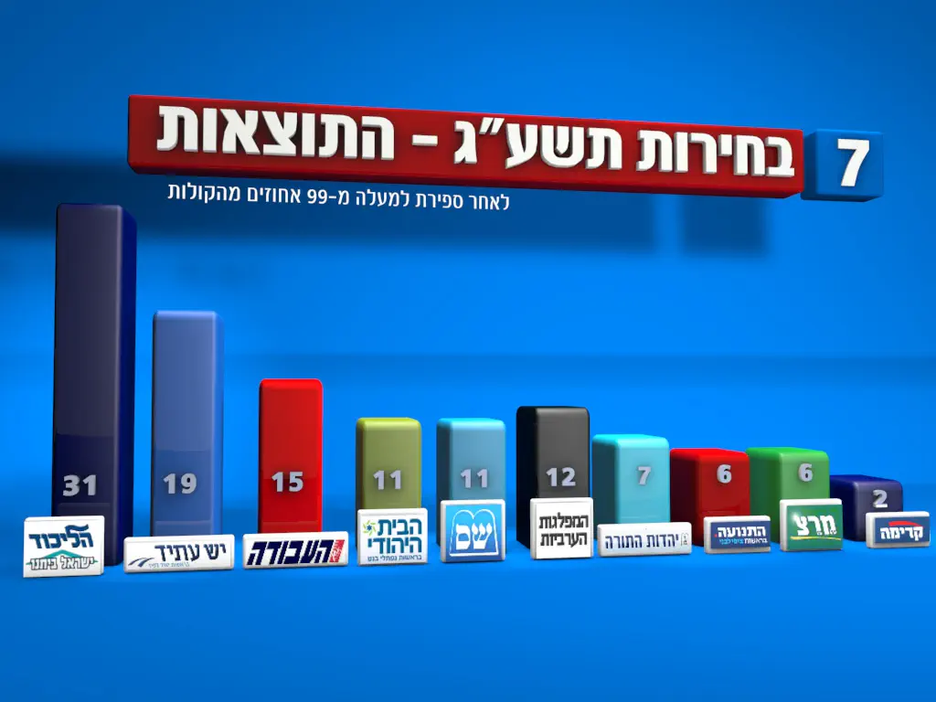 הבחירות לכנסת. לאחר ספירה של 99 אחוזים מקולות האמת, בלי המעטפות הכפולות, תיקו בין גוש הימין והחרדים לגוש המרכז, שמאל וערבים -- 60 מושבים בכנסת לכל גוש.