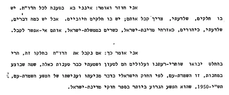 "אם נקבל את הדו"ח בחלקו זה, הרי בהחלט יבואו שוחרי רעתנו והם עלולים לטעון ושמעתי כבר טענות כאלה, שמה שבוצע במחנות, זו השמדת עם, לפי החוק הישראלי בדבר מניעתו וענישתו של הפשע השמדת עם...שהוא הפשע החמור ביותר בספר חוקי מדינת ישראל", אמר שרון בישיבה.