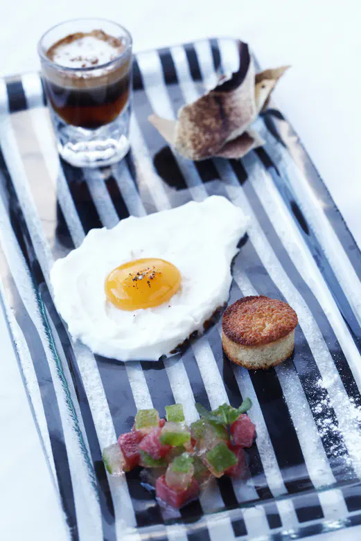 קינוח "ארוחת בוקר" – קינוח מרהיב ומפתיע המכיל "ביצת עין" עשויה מספרה של מנגו על קרם פנקוטת וניל וסוכר חום, לצד "לחם" פיננסייר שקדים, "סלט קצוץ" עשוי קוביות ג'ל של תותים ונענע וכוסית "קפה" שהיא למעשה שוט של אמרטו.