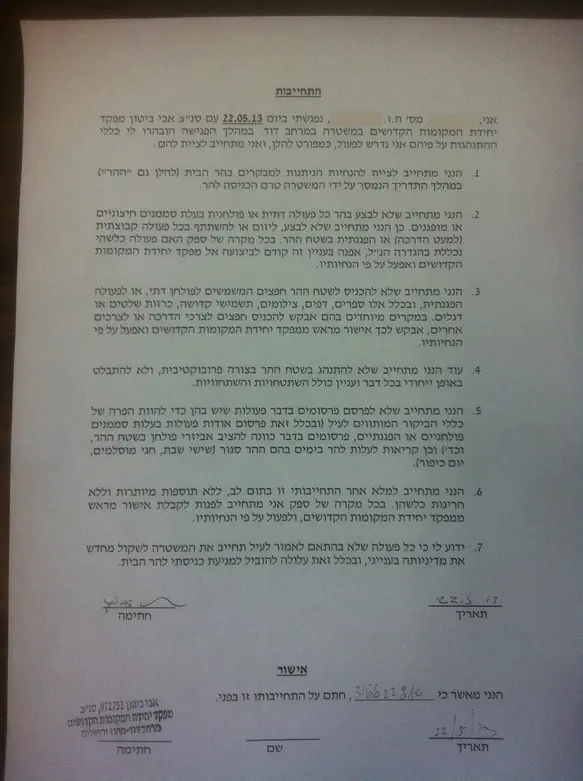 בהמשך השיחה איתו התייחס גליק למסמך שעליו התחייב לחתום אחד המבקרים בהר על מנת לאפשר לו את העלייה. מדובר במסמך שנחתם במעמד סנ"צ ביטון ובו הוא מתחייב ש"לא לבצע בהר כל פעולה פולחנית בעלת סממנים חיצוניים או מופגנים". כמו כן נכתב במסמך: "הנני מתחייב שא להכניס לשטח ההר חפצים המשמשים לפולחן דתי או לפעולה הפגנתית ובכלל אלו ספרים, דפים, צילומים, תשמישי קדושה, כרזות, שלטים או דגלים". עוד נאמר במסמך: "הנני מתחייב שלא להתנהג בשטח ההר בצורה פרובוקטיבית ולא להתבלט באופן ייחודי בכל דבר ועניין כולל השתטחויות והשתחוויות".