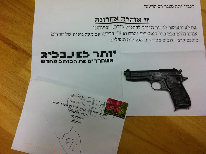 בלשכות הרבנים הראשיים לישראל, הרב יונה מצגר והרב שלמה עמאר התקבלו הבוקר (ב') מכתבים זהים ובהם תמונת אקדח והכיתוב "זו אזהרה אחרונה".