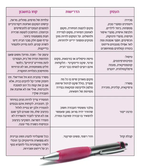 למעשה, התשובה לשאלה אודות המיקום של העסק אינה כה פשוטה, והיא קשורה בתשובה לשאלה מהו העסק שאת רוצה להקים. בטבלה הבאה ריכזתי בשבילך מגוון של עיסוקים שאפשר להכניס הביתה אם רק יש מקום מתאים.