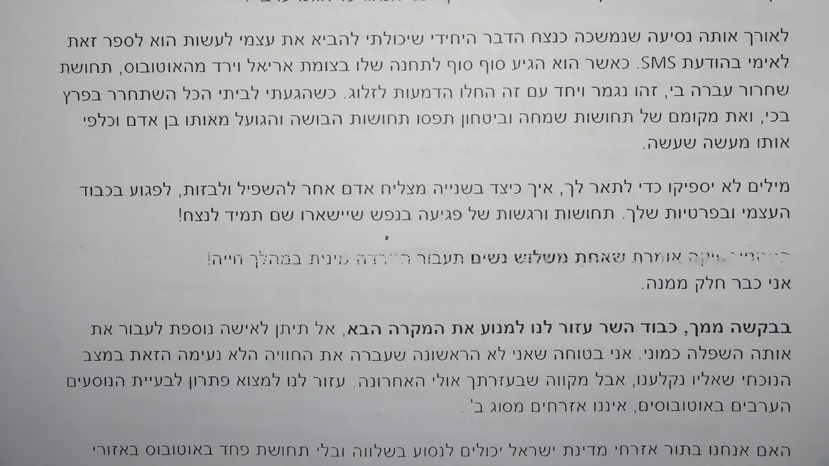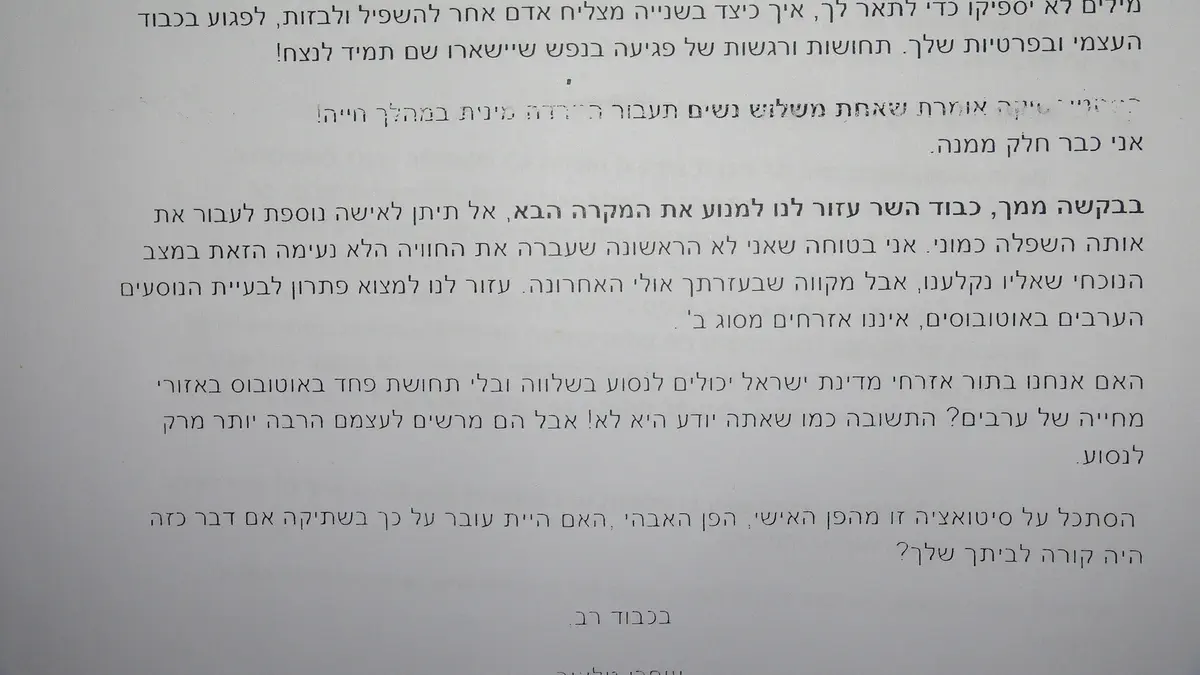 ע' מתחננת בפני שר התחבורה, "איך בשנייה מצליח אדם אחר להשפיל ולבזות, לפגוע בכבוד העצמי ובפרטיות שלך. תחושות ורגשות של פגיעה בנפש שיישארו שם תמיד לנצח. בבקשה ממך כבוד השר עזור לי למנוע את המקרה הבא אל תיתן לאישה נוספת לעבור את אותה השפלה כמוני".