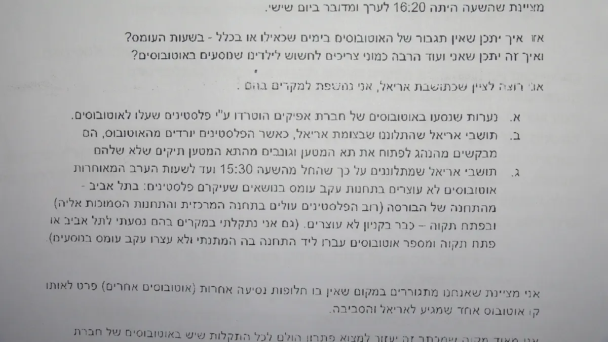 מקרה נוסף של אמא שכותבת לראש עיריית אריאל, "בתי התיישבה באוטובוס ובא אליה ערבי והתיישב לידה כאשר היה די מקום באוטובוס הוא כביכול 'נרדם' עליה והניח את ראשו עליה היא מעירה לו מספר פעמים ובכל פעם הוא חוזר על כך".