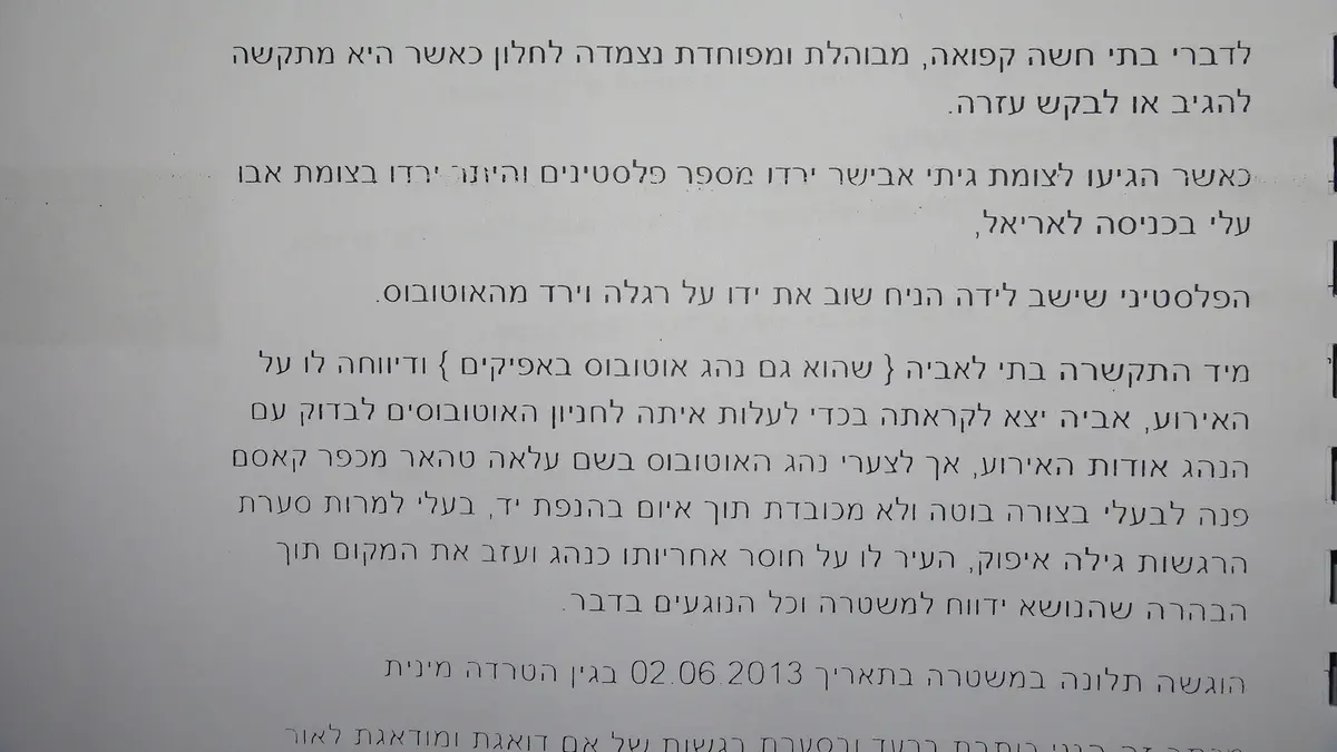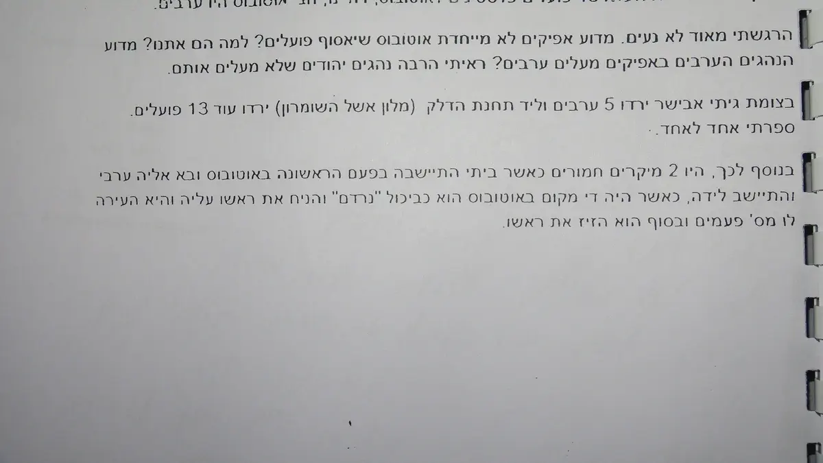 ע' ממשיכה וכותבת, "במהלך הנסיעה הערבי התיישב לצידי כאשר אני בחלקו הפנימי של המושב התחיל לשלוח לי ידיים פעם אחר פעם העפתי את ידו מעליי ואמרתי לו להפסיק. ניסיתי לזוז בכיסא ולהתרחק ממנו אך דבר לא עניין אותו והוא המשיך בשלו. תחושת הקיפאון והפחד לקחו ממני את היכולת לקום מהכיסא ולהתלונן בפני הנהג על אותו ערבי".