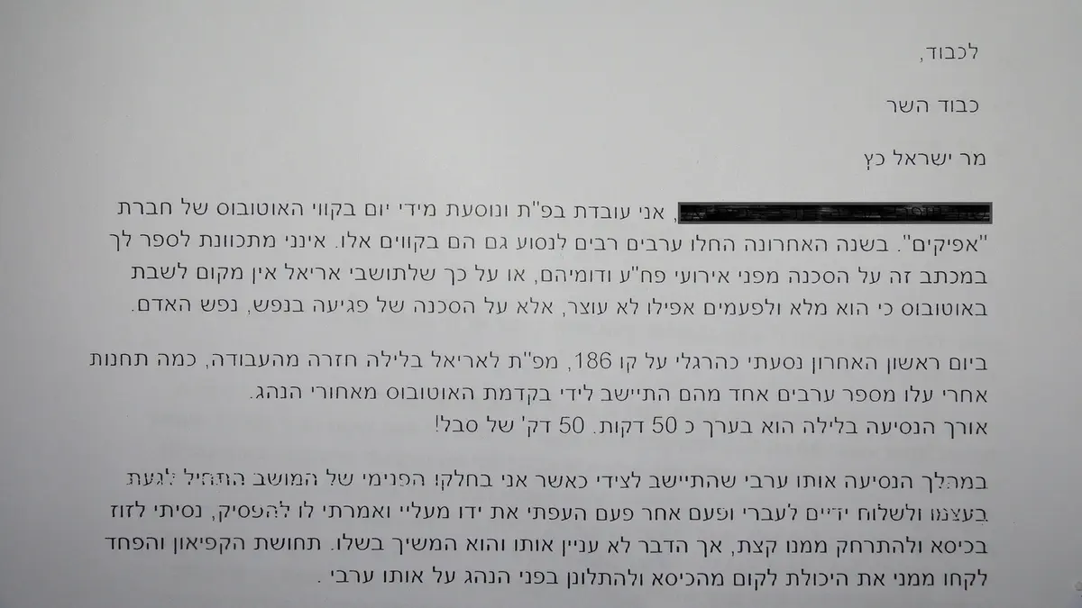 בימים האחרונים הגיעו למערכת ערוץ 7 מכתבים שנשלחו לשר התחבורה, ישראל כץ, וראש עיריית אריאל בהם כותבות נשים כי הוטרדו מינית על ידי ערבים בתחבורה הציבורית בקווים מהמרכז לשומרון.